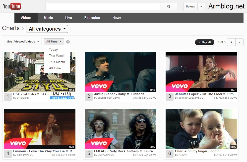 7.Youtube-ի մենաշատ դիտված տեսահոլովակն արդեն ունի 1 միլիարդից ավել ցուցադրումներ (Gangnam Style):
